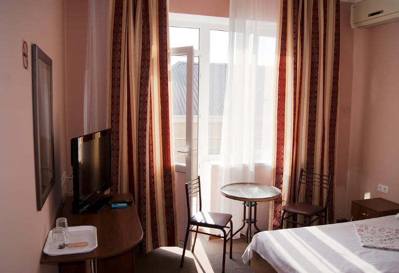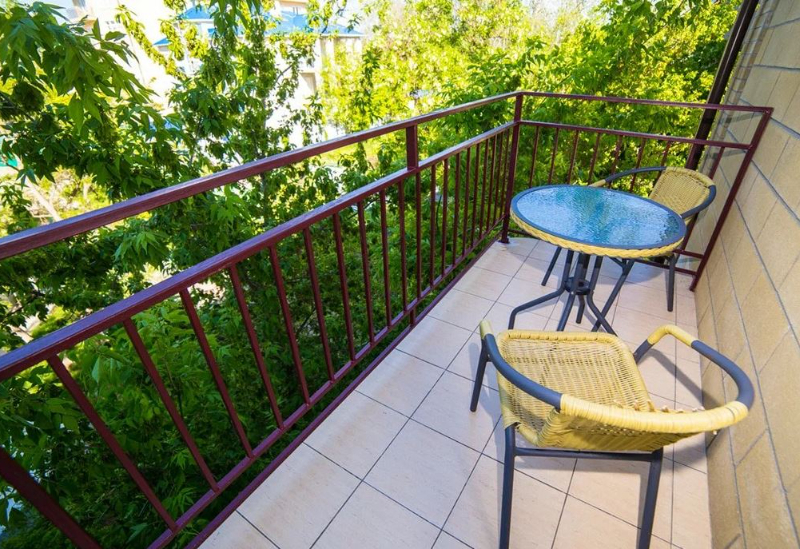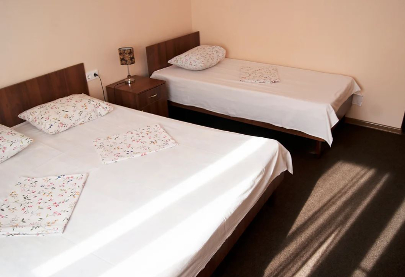 Площадь номера - 18-20 кв.м. 1 комната. 3 осн. места. часть номеров - коннект. В номере: телевизор; холодильник; балкон; кондиционер; ванна; туалет; 2-спальная кровать; 1-спальная кровать; раковина; шкаф.